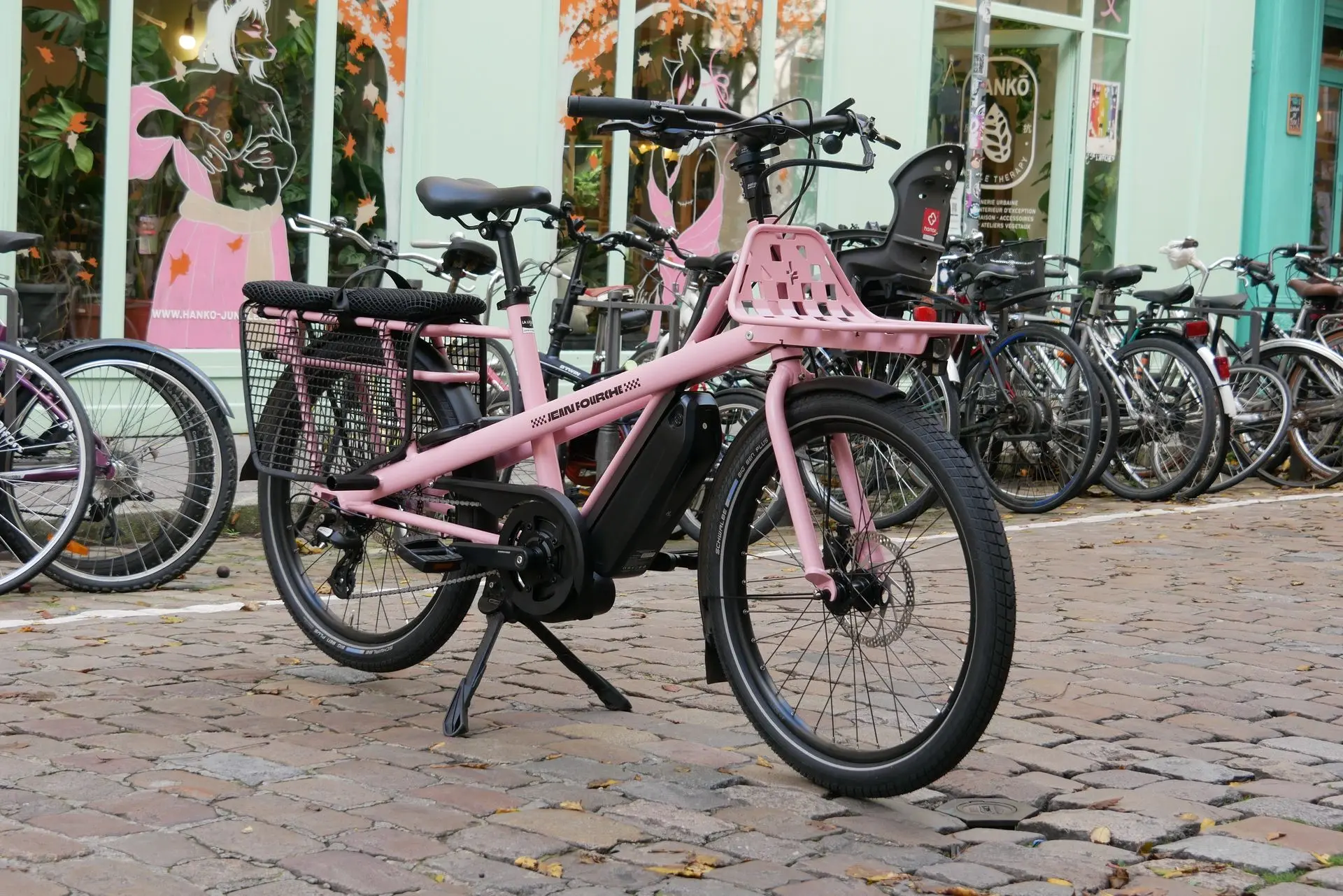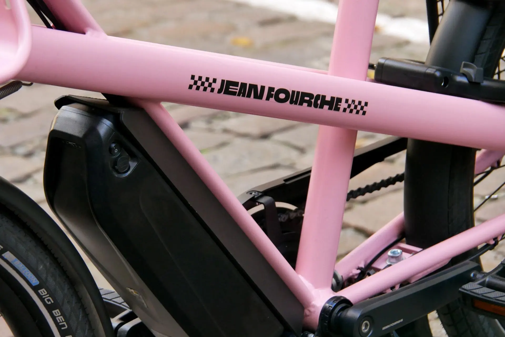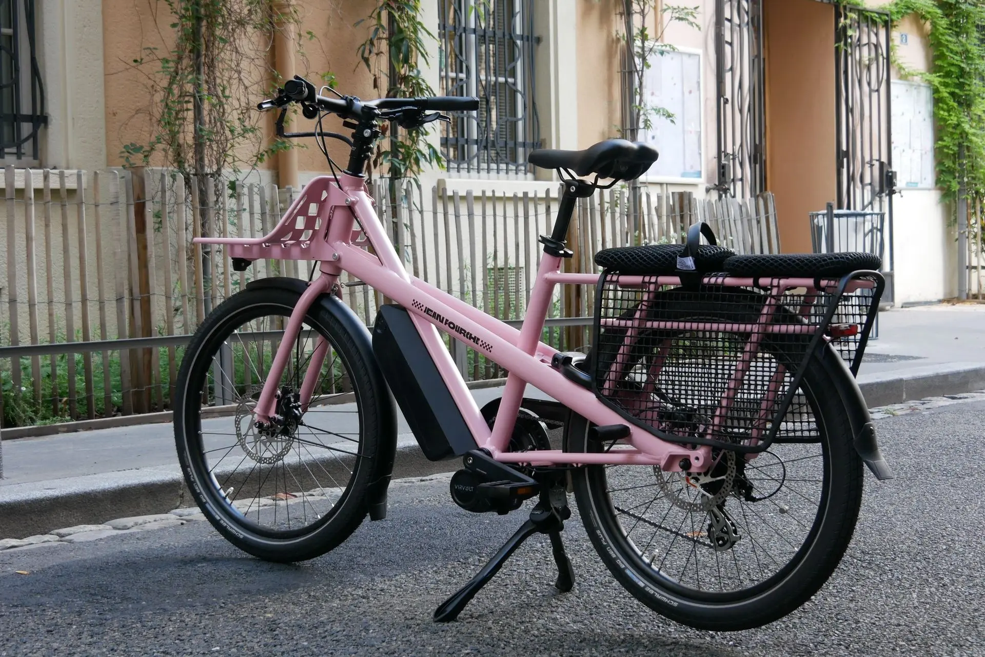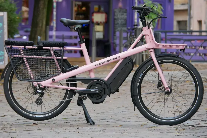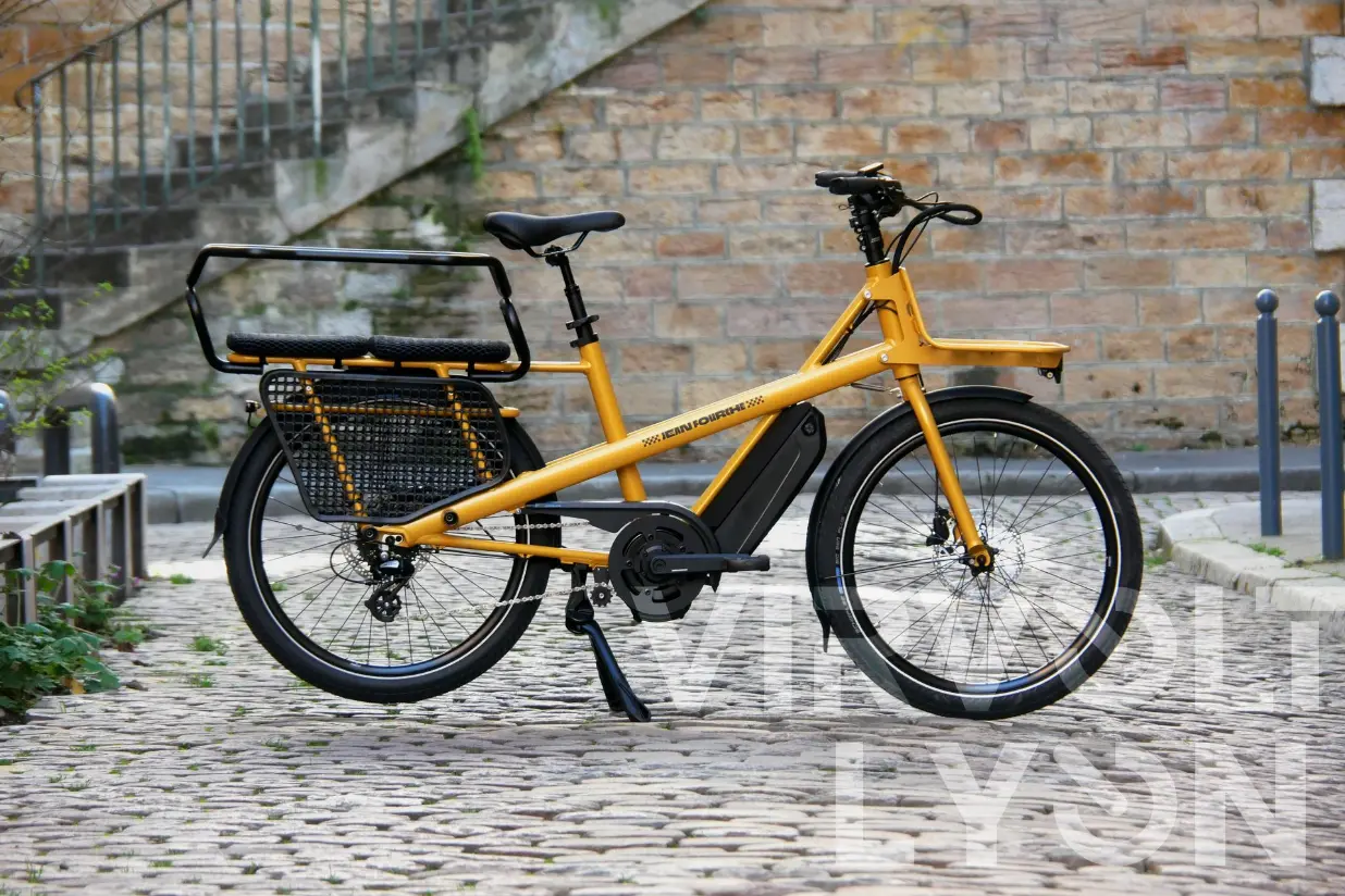 Vélo longtail compact électrique avec un cadre en aluminium.